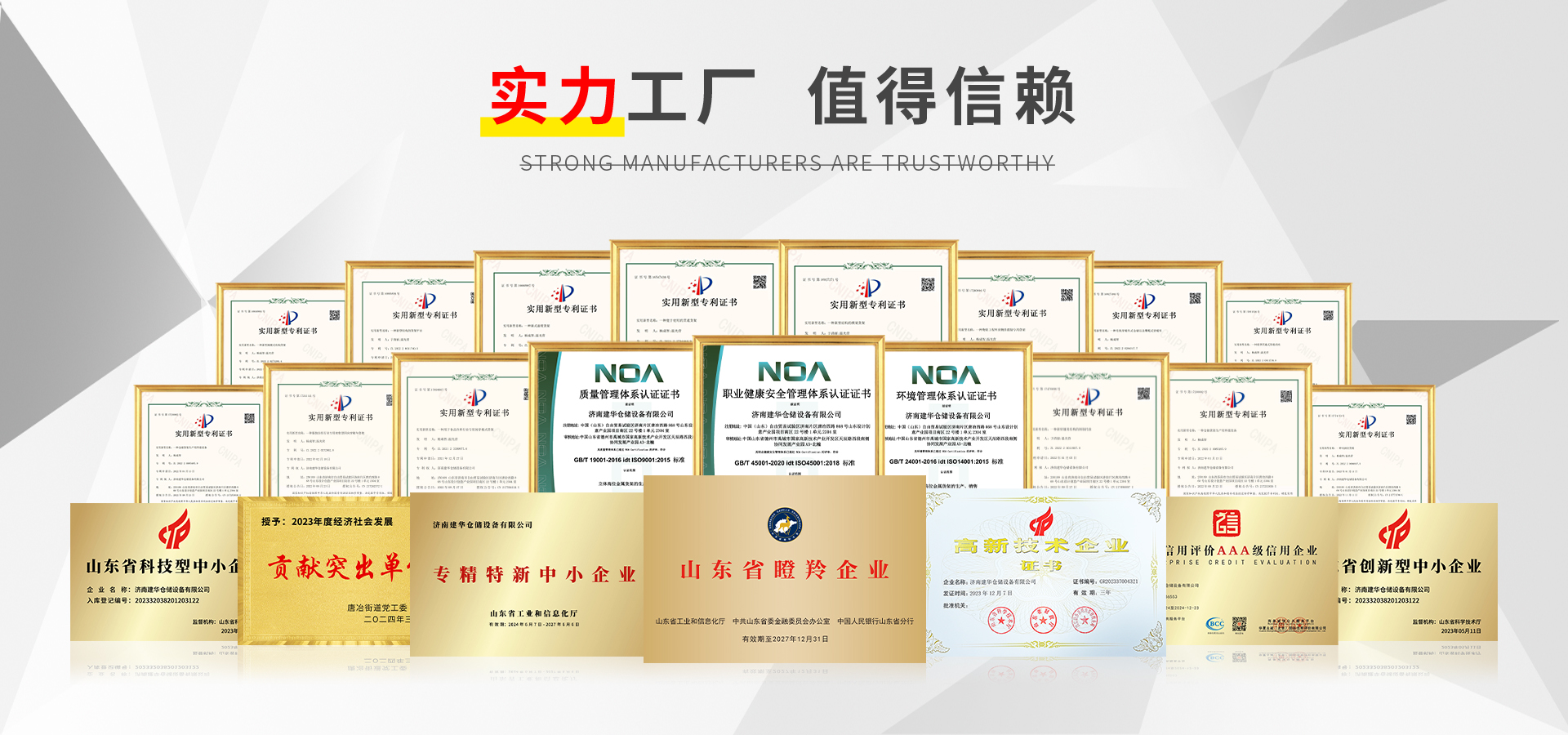 濟(jì)南建華倉(cāng)儲(chǔ)設(shè)備有限公司,成立于2012年,是山東現(xiàn)代化企業(yè)倉(cāng)儲(chǔ)設(shè)施設(shè)備的生產(chǎn)制造企業(yè),經(jīng)過(guò)數(shù)年的行業(yè)洗禮,已成為業(yè)內(nèi)知名的標(biāo)兵企業(yè)。公司是國(guó)家認(rèn)定的高新技術(shù)企業(yè)、科技型中小企業(yè)、瞪羚企業(yè),專(zhuān)精特新企業(yè),并獲得多項(xiàng)信用評(píng)級(jí)AAA證書(shū)、安全生產(chǎn)許可證,三體系(質(zhì)量、環(huán)境、職業(yè)健康)認(rèn)證,17項(xiàng)產(chǎn)品專(zhuān)利證書(shū)及軟件著作權(quán)。多年來(lái)建華一直致力于工業(yè)貨架品的研發(fā)、生產(chǎn)和應(yīng)用,現(xiàn)已發(fā)展成為年產(chǎn)量數(shù)萬(wàn)噸的大型貨架綜合企業(yè)。建華以雄厚的資金和技術(shù)力量為依托,以先進(jìn)的檢測(cè)標(biāo)準(zhǔn)和完善的生產(chǎn)設(shè)施為保證,憑借著高品質(zhì)的產(chǎn)品,良好的信譽(yù),優(yōu)質(zhì)的服務(wù),產(chǎn)品暢銷(xiāo)全球近三十多個(gè)國(guó)家,客戶(hù)遍布中東、東南亞、歐美等各個(gè)區(qū)域。打造百年建華品牌,成為建華人不懈努力追求的方向。